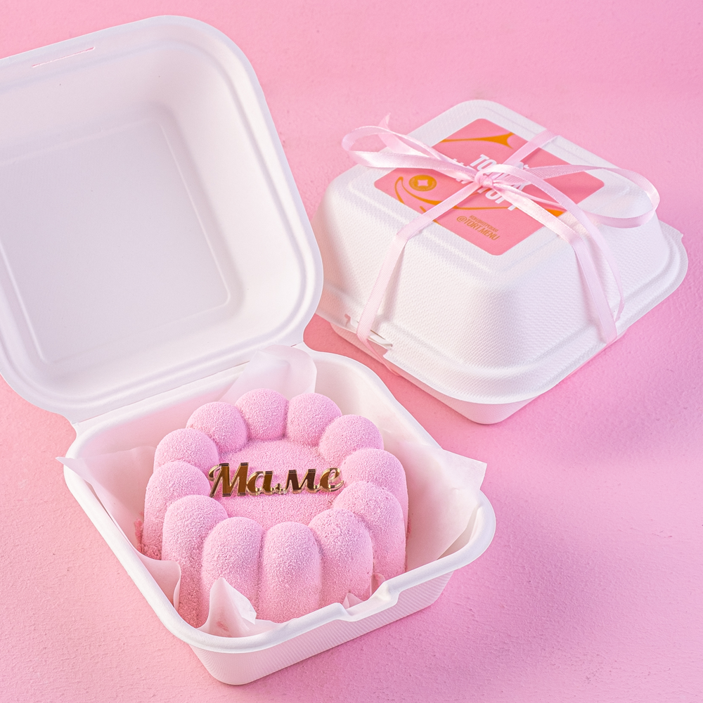 Клубничный мусс, бисквит на миндальной муке, клубничное компоте, лаймовый чизкейк, покрытие шокладный велюр, акриловый топпер "Маме"